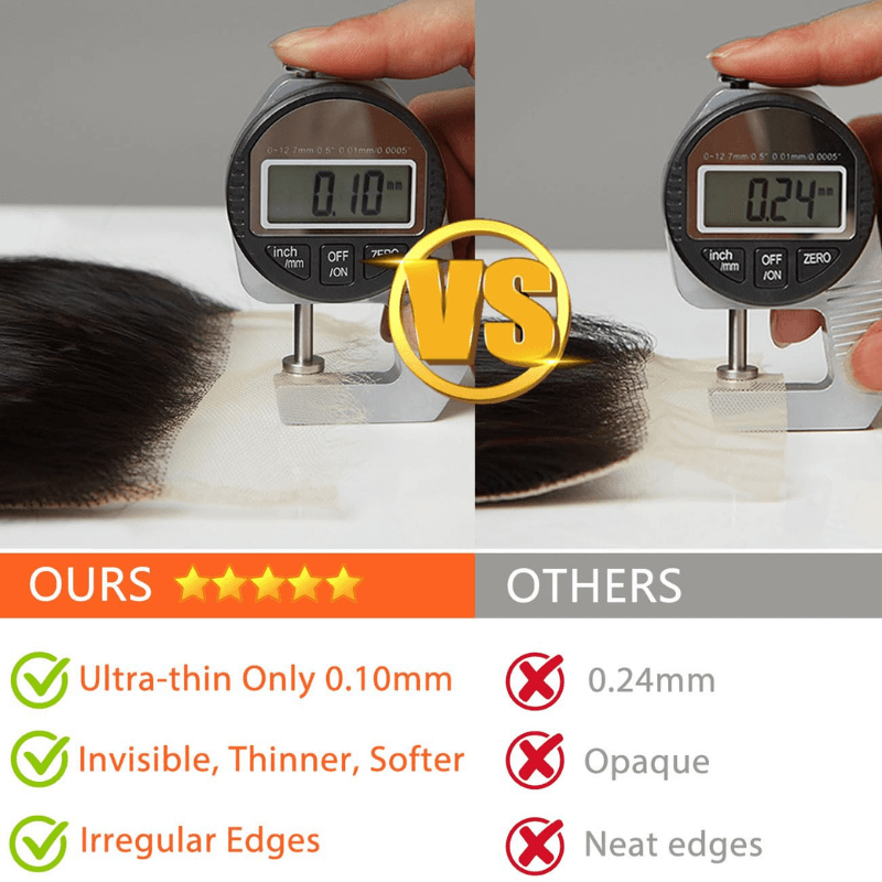 Why 0.10mm millimeters of invisible Swiss lace? : HD Lace Closure, Real HD Lace is also Called Ultra-invisible Lace, it has Irregular Edges, is Ultra-thin Only 0.10mm, More Invisible Thinner, Softer, and Lighter than Transparent Lace. Match all Skin Tones Perfectly